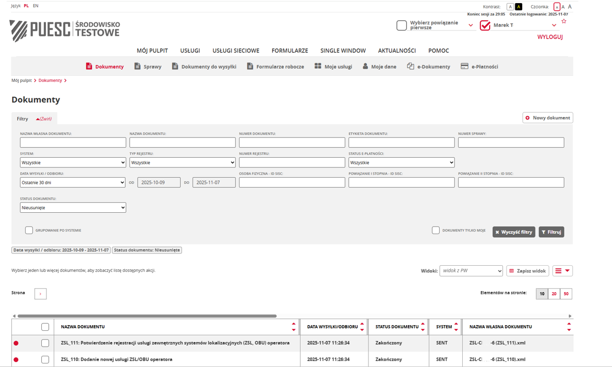 Po zalogowaniu się do swojego konta na PUESC Operator powinien otworzyć zakładkę "Mój pulpit", następnie "Dokumenty" i po rozwinięciu pola "Filtry" wskazać z rozwijalnej listy w polu "Data wysyłki/odbioru" odpowiedni zakres dat, po czym odszukać formularz ZSL_101, w którym jest zapisane hasło do logowania do usługi.