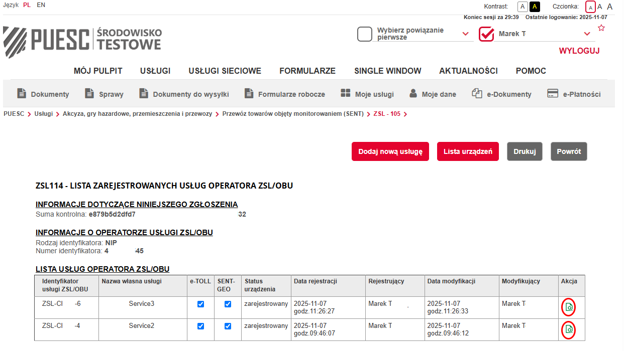 Откройте форму ZSL_105: https://test.puesc.gov.pl/web/guest/uslugi/przewoz-towarow-objety-monitorowaniem/sent-105 – войдите в систему с данными из ZSL_101. Здесь вы отправляете CSR, добавляете IP-адреса. После завершения этого процесса вы сможете добавлять услуги и устройства в свою учетную запись.